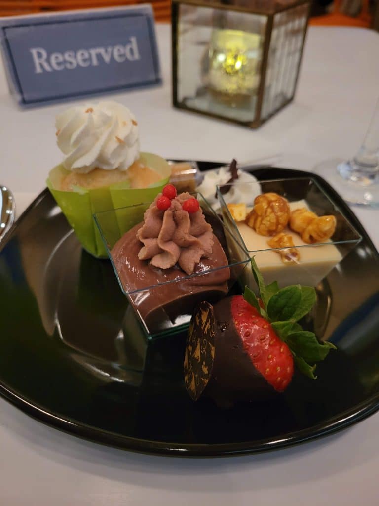 Back in December, when I was traveling solo for work, I decided to try out one of the parties in the Magic Kingdom. Since I was traveling solo, the cost was far less than when I was traveling with my family. I opted for the Magic Kingdom 50th Fireworks Dessert Party- Disney Enchantment Pre-Party. With this party, you’ll enjoy the desserts plus an assortment of beer and wine before the fireworks start. I was seated in the lower section which meant every time I wanted to grab something, I’d have to cross the public pathway to the upper level.