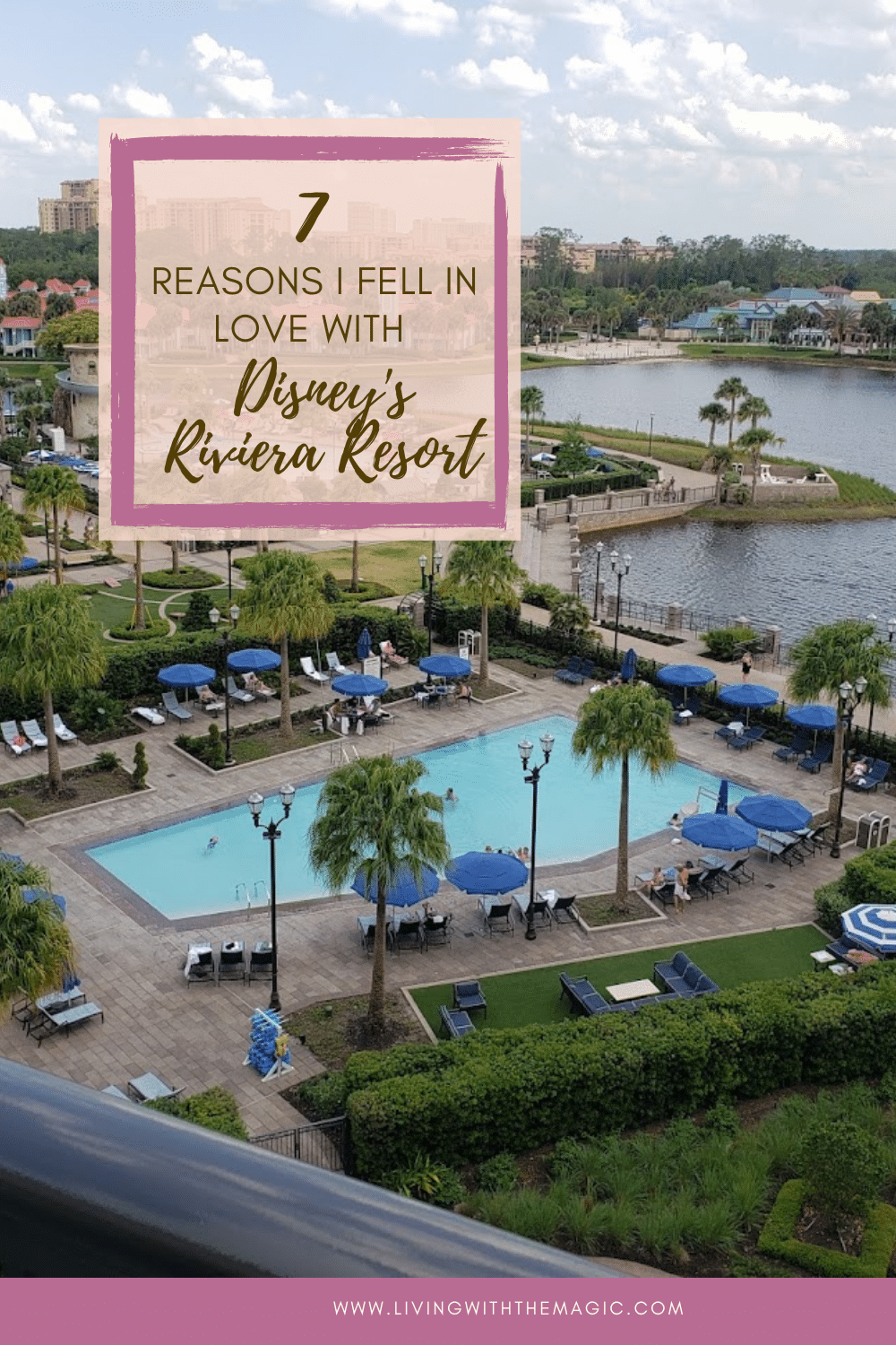 Disney’s Riviera resort offers two amazing pools! One is a quiet pool while the other is a feature pool complete with a water slide AND splash pad!